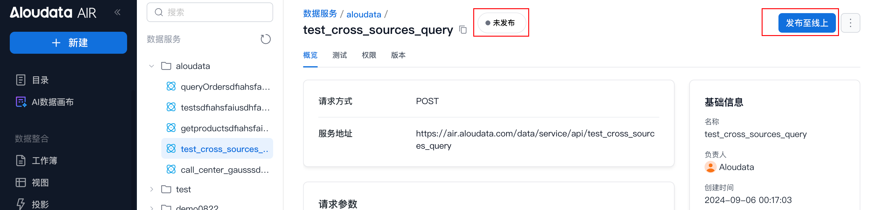 数据服务创建后默认为未发布状态,点击“发布至线上”即可完成发布。