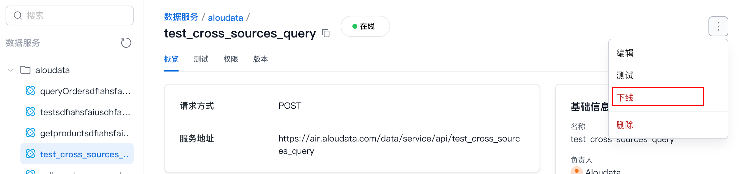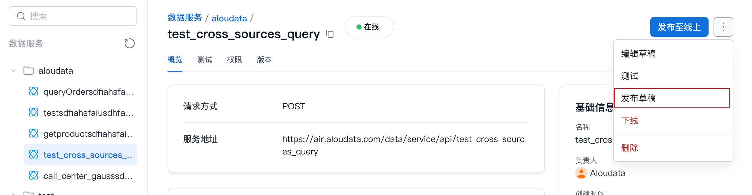 已发布的数据服务可进行下线操作。编辑处于在线状态的服务将生成草稿,支持编辑草稿并重新发布。